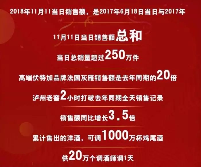 據京東數據統計,2018年11.11當日京東酒業總銷量超過250萬件,銷售額是2017年6月18日當日與2017年11月11日當日銷售額總和,實現了增速和銷量的雙重突破。在各個細分品類下,京東酒業同樣表現不俗。葡萄酒在這次狂歡節中,30分鐘,銷量破百萬瓶;啤酒一小時即售出200萬罐;24小時內累計售出的洋酒,可調1000萬杯雞尾酒,供20萬個調酒師調1天。而在白酒領域,今年11.11,占據京東酒業白酒品牌銷售榜單是茅臺,五糧液、瀘州老窖緊隨其后。
