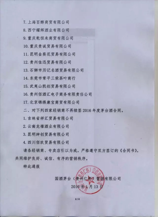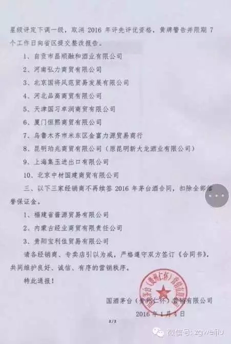 繼1月4日,茅臺營銷有限公司發(fā)布《關于對個別經(jīng)銷商違約行為的處理通報》,對16家違規(guī)酒商進行處罰后,1月13日,茅臺銷售有限公司再度下發(fā)《關于對個別經(jīng)銷商違約行為的處理通報》文件,此次文件則處理了21家違規(guī)經(jīng)銷商,其中4家不再續(xù)簽2016年合同。