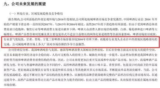蘭州黃河在2017年年報中坦承:“甘肅、青海、寧夏三省啤酒市場容量下降,隨著行業龍頭企業在中西部地區戰略布局的完成,公司屬地啤酒市場上各大廠商對市場份額的爭奪日益激烈。