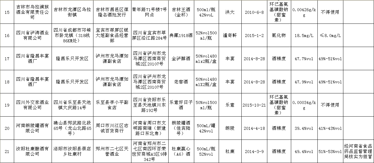 四川隆昌豐宴酒廠生產的老窖酒檢測值47.9%vol,標準值為50±1%vol,比標準值下限低1.1%vol、金瀘醇酒檢測值47.7%vol,標準值為50±1%vol,比標準值下限低1.3%vol;
