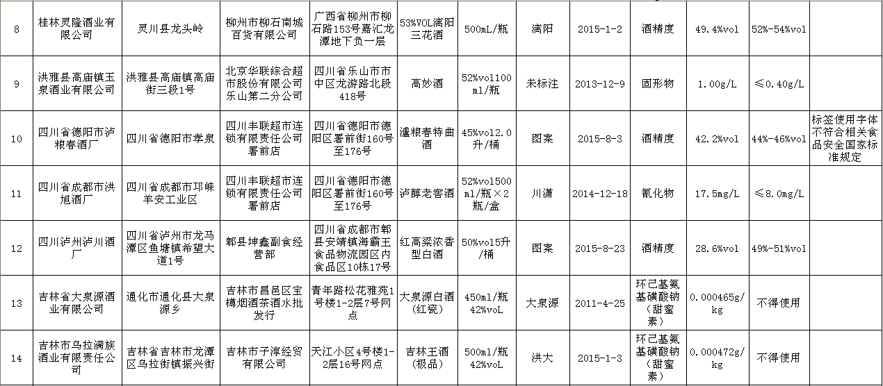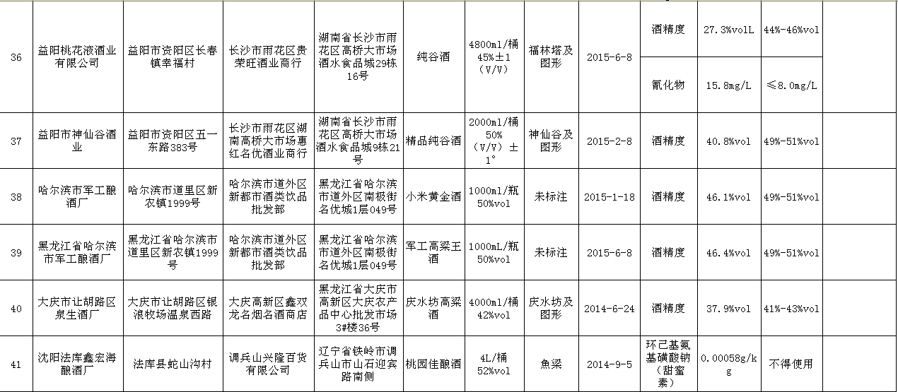 3月17日,國家食品藥品監督管理總局網站發布通告(2016年第59號),2015年10月至12月,國家食品藥品監督管理總局組織抽檢白酒943批次樣品,抽檢結果顯示,抽檢檢驗項目合格樣品901批次,不合格樣品42批次。
