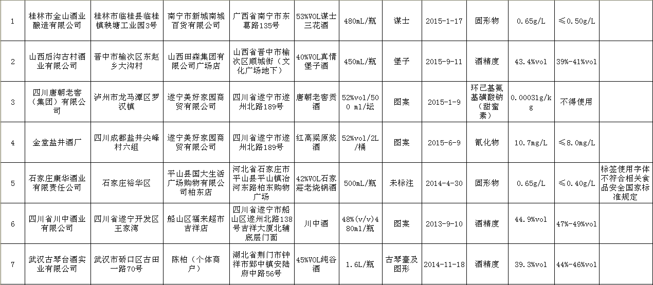 廣西桂林市金山酒業釀造有限公司生產的53%VOL謀士三花酒檢測值0.65g/L,標準為不超過0.50g/L,超標0.3倍;