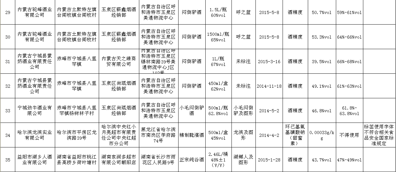 內蒙古駝峰酒業有限公司生產的悶倒驢酒(60%vol)檢測值50.7%vol,標準值為60±1%vol,比標準值下限低8.3%vol、悶倒驢酒(65%vol)檢測值53.3%vol,標準值為65±1%vol,比標準值下限低10.7%vol;