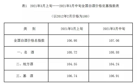 據全國白酒價格調查資料顯示,2021年3月中旬全國白酒商品批發價格定基總指數為107.06,上漲7.06%。其中,名酒價格指數為108.88,上漲8.88%;地方酒價格指數為104.24,上漲4.24%;基酒價格指數為106.91,上漲6.91%。(見表1)