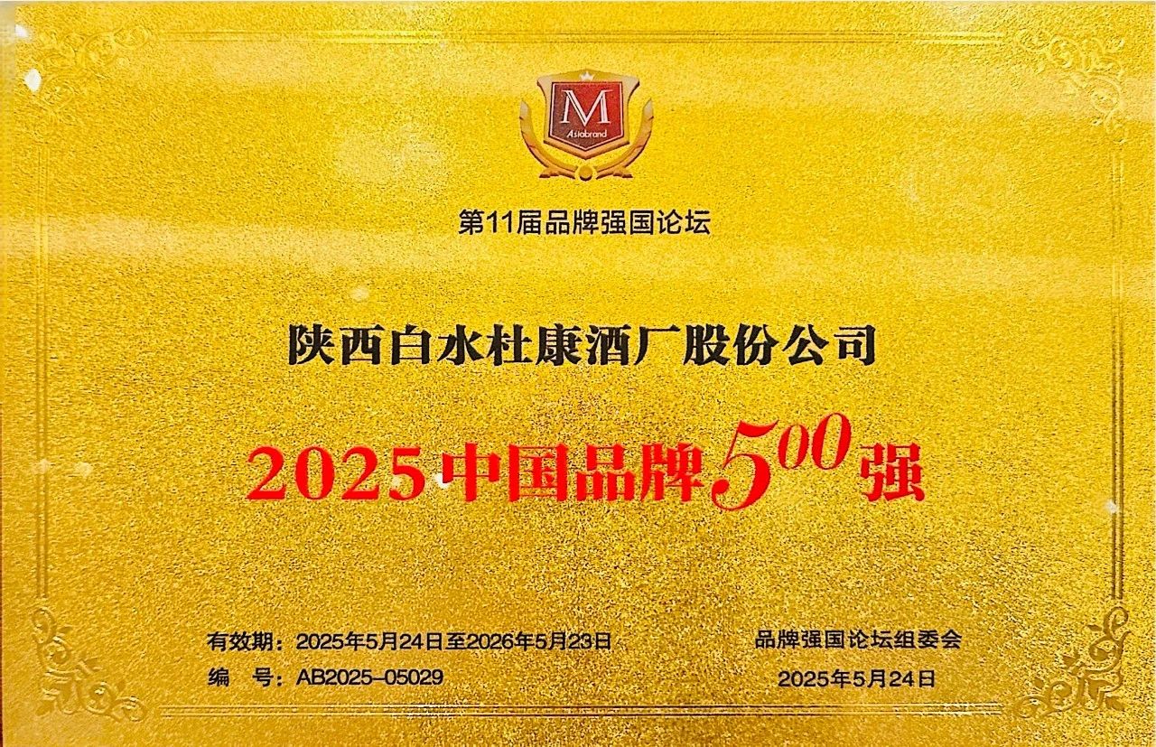 5月24日,由專業品牌評價機構Asiabrand發起主辦,中國亞洲經濟發展協會、香港一帶一路總商會等權威機構聯合主辦的第11屆“品牌強國論壇”在深圳隆重舉行。論壇現場重磅發布“2025中國品牌500強”榜單,陜西白水杜康酒廠股份有限公司憑借深厚的歷史文化底蘊、卓越的產品品質成功入選,彰顯了民族白酒品牌的標桿地位。