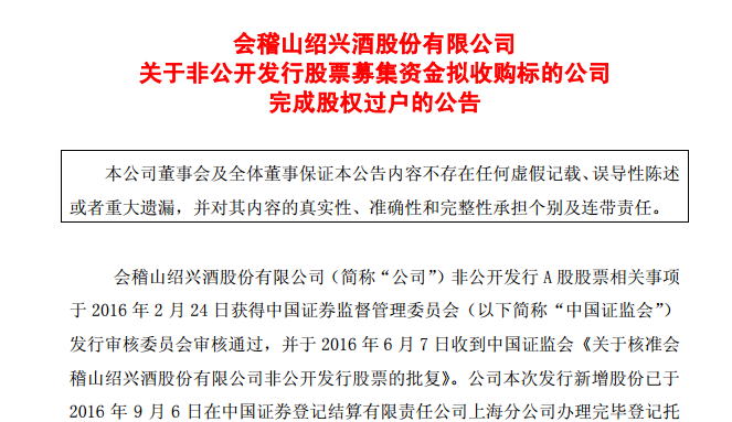 佳釀網(公眾號:jianiang_cn)記者了解到,在9月7日,會稽山對外披露稱,定增方案獲得證監會核準,會稽山擬針對6名發行對象定向增發普通股9736萬股,共募集資金13.28億元(未扣除發行費用),用于技術改造、收購烏氈帽酒業100%股權及收購紹興縣唐宋酒100%股權等項目。會稽山表示,上述收購及兼并項目將有助于拓展銷售渠道,建立多樣化銷售層次、提升銷售規模,增加原酒儲量。