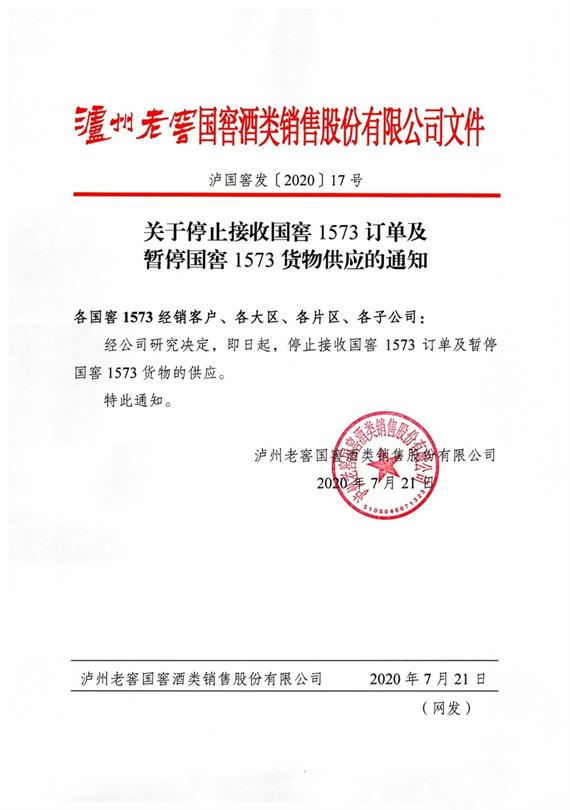 7月21日,瀘州老窖國窖酒類銷售股份有限公司下發《關于停止接收國窖1573訂單及暫停國窖1573貨物供應的通知》。
