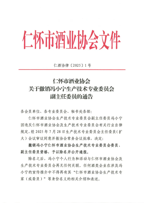 7月28日,仁懷市酒業協會發布通告稱,撤銷馮小寧仁懷市酒業協會生產技術專業委員會委員、副主任委員資格,予以除名并公開通報。