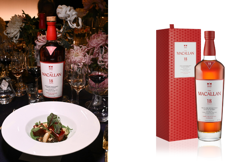 麥卡倫經典雪莉桶18年單一麥芽蘇格蘭威士忌,酒體飽滿馥郁,散發著深邃的干果甜韻與香料氣息。它與雪龍和牛(精選低脂牛肩肉)相搭配,在風味上形成優雅的呼應——威士忌中復雜的木質與干果香調,不僅襯托出和牛醇厚細膩的本味,也與玫瑰腐乳的東方發酵香氣、朝鮮薊的清雅及野生蘑菇XO醬意大利餃子的濃郁餡料和諧交融,共同演繹出一場層次豐富、東西合璧的味覺交響。