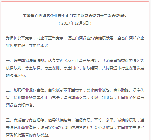 《安徽省白酒知名企業反不正當競爭聯席會議自律宣言》全文如下: