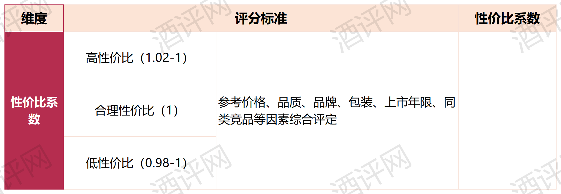最后,對于一款白酒產品而言,拋開價格談質量或者拋開質量談價都是荒謬的,因此,性價比也是影響消費者認可度的重要因素。參考了品質力、品牌力、顏值力、上市時間和同類競品等因素綜合評定之后,酒評網還會為每一款產品的最終得分都增加一個性價比系數。