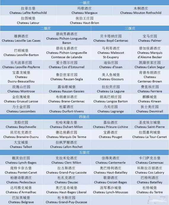 直至今日,這份分級名單中的列級莊已增加至61座,其中有5座一級莊、14座二級莊、14座三級莊(Third Growth)、10座四級莊(Fourth Growth)和18座五級莊(Fifth Growth)。這61座列級莊中,有60座位于梅多克地區,只有侯伯王莊園位于格拉夫產區。