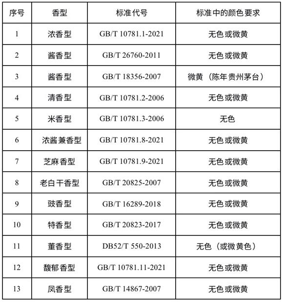 新修訂的《白酒工業術語》和《飲料酒術語和分類》中對白酒的定義為“以糧谷為主要原料,以大曲、小曲、麩曲、酶制劑及酵母等為糖化發酵劑,經蒸煮、糖化、發酵、蒸餾、陳釀、勾調而成的蒸餾酒”,并沒有給出對白酒顏色的要求。不過梳理每一香型白酒國家標準(或地方標準)的感官要求,可以大體將白酒的顏色分為三類:無色、無色或微黃、微黃。