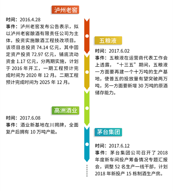 2017年,隨著市場回暖,供求關系的變化,第二輪產能擴張以茅臺、五糧液牽頭,多家名酒企同步跟進。