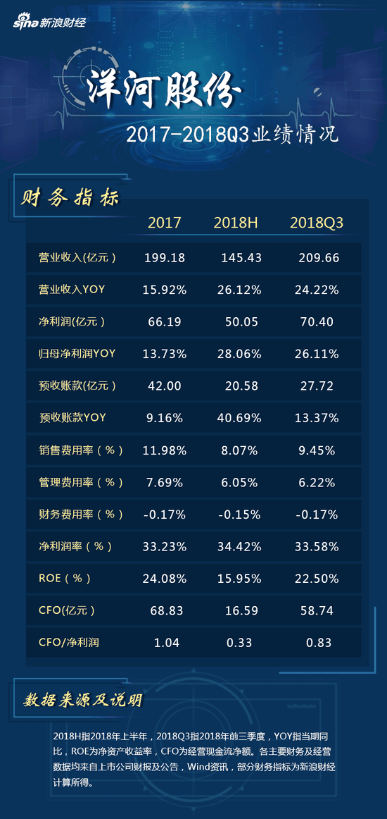 2017年洋河實現營業收入199.18億元,是五糧液的66%;實現凈利潤66.27億,也是五糧液的66%。而在這前,洋河的凈利潤一度占到過五糧液凈利潤的84%。