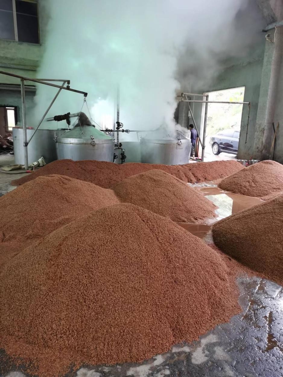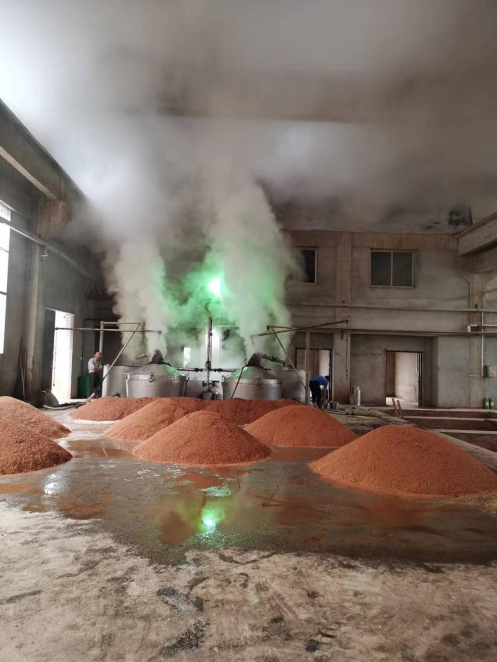 從重陽下沙開始,就標志著茅源人一年一輪回的釀酒活動正式拉開序幕。一月過后,工人把下沙輪次形成的“熟沙”與經過開水浸潤后的“生沙”進行一比一拌和。接著,上甑蒸煮,“沙”在水蒸氣的作用下逐步被蒸熟,下甑后的糟醅與“量水”融合,不僅可以使粘性極高的糟醅分質,而且便于后續操作。