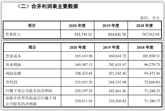 根據招股書,2020年,郎酒股份實現營業收入93.37億元,同比增長11.85%;實現凈利潤25.21億元,同比增長3.17%。