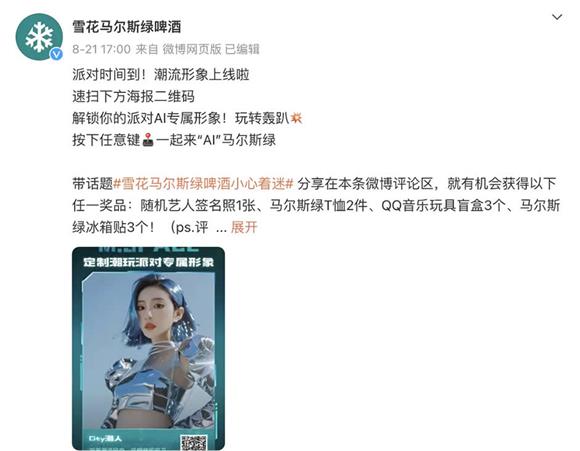 同時,雪花馬爾斯綠在線上發起消費者互動“打造你的aigc潮流派對形象”,吸引參演藝人打卡,引發了更多年輕用戶廣泛參與。對于夜場渠道伙伴而言,此次打造潮玩音樂派能夠幫助他們吸引更多客流,打造創新的消費體驗,為促進夜場消費增長賦能。通過線上互動+品牌大使引導,引流至線下渠道互動,雪花馬爾斯綠能夠線上線下同步營造整體新生代潮玩氛圍。