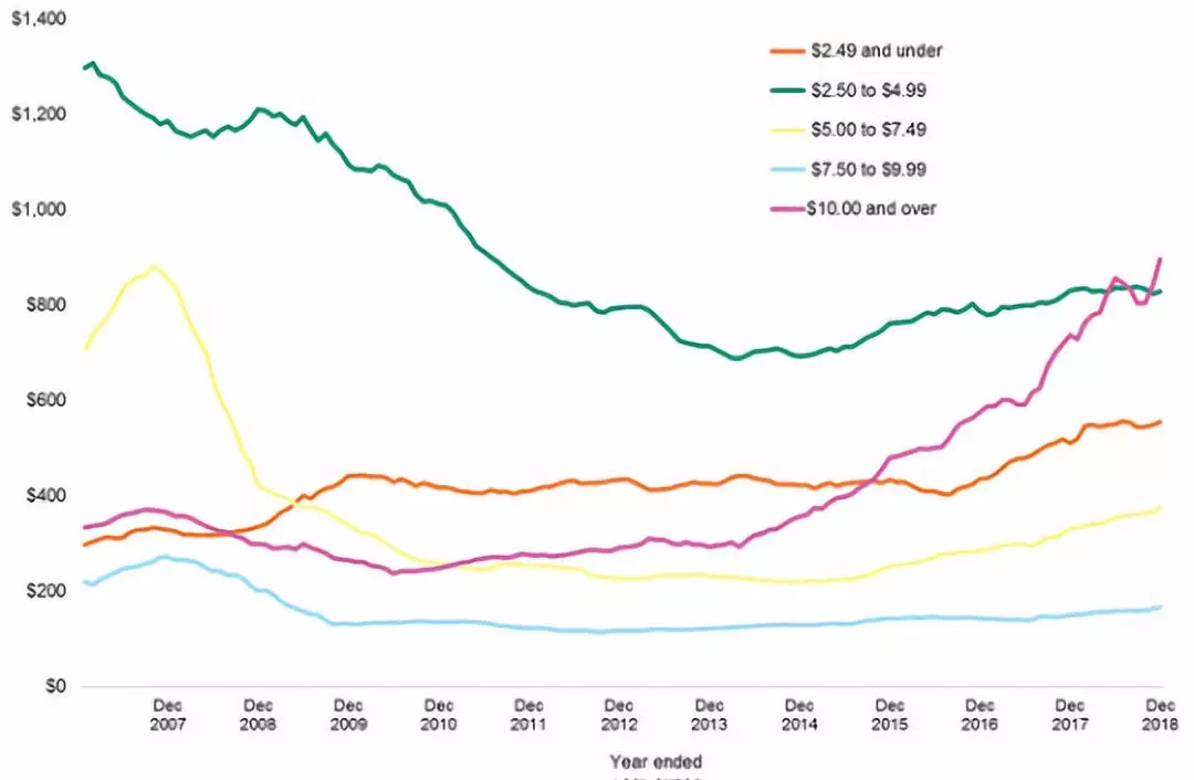 2007-2018年各價格區間(離岸價)出口額變化趨勢