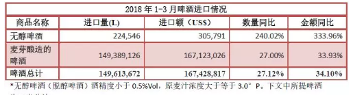 1-3月,啤酒進口增速進一步放緩,進口量1.5億升,同比增長27.1%,進口額1.7億美元,同比增長34.1%。
