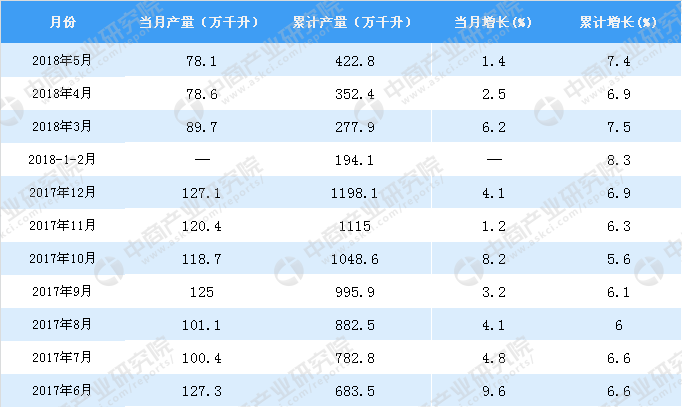 據中商產業研究院大數據庫顯示,2018年5月全國白酒產量為78.1萬千升,同比增長1.4%。2018年1-5月全國白酒產量為422.8萬千升,累計增長7.4%。