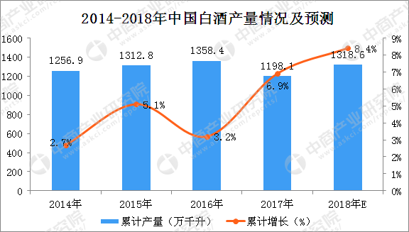 從近幾年白酒產量的情況來看,白酒產量基本保持著穩定增長的態勢。2013年—2016年間我國白酒產量在1300萬千升左右,但2017年中國白酒產量呈現下滑趨勢,2017年白酒產量在1198.1萬千升,比2016年少160.3萬千升,累計下滑6.9%。據中商產業研究院數據預測:預計2018年我國白酒產量達1318.6萬千升。