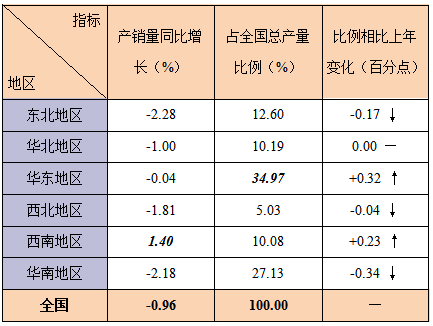 表二 2014年全國各地區啤酒產銷量及變化情況