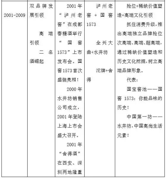 中國酒業(yè)的品牌發(fā)展又可分為三個階段,以五糧液、瀘州老窖、劍南春等川酒六朵金花為代表的品牌形象階段,以瀘州老窖+國窖、全興+水井、十八酒坊+老白干坊等為代表的雙品牌階段,以洋河藍(lán)色經(jīng)典,古井貢酒的年份原漿系列為代表的品牌裂變階段。
