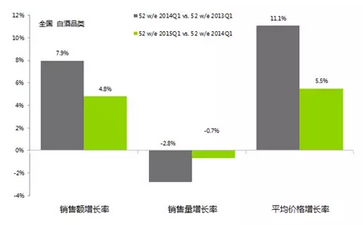 凱度消費(fèi)者指數(shù)(Kantar Worldpanel)對(duì)于中國(guó)城市家庭購(gòu)買的監(jiān)測(cè)顯示,伴隨整體宏觀經(jīng)濟(jì)持續(xù)下行態(tài)勢(shì)和政府反腐打奢的力度加大,白酒市場(chǎng)高速增長(zhǎng)時(shí)代終結(jié)。整體市場(chǎng)銷售額增速在最近一年仍然下滑,但銷售量負(fù)增長(zhǎng)的趨勢(shì)開(kāi)始企穩(wěn)。白酒行業(yè)的增長(zhǎng)仍然以價(jià)格驅(qū)動(dòng)因素為主。