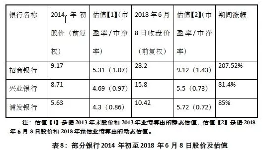 表8統(tǒng)計(jì)了部分銀行的股價(jià)從2014年年初到2018年6月8日的股價(jià)漲幅及估值情況。