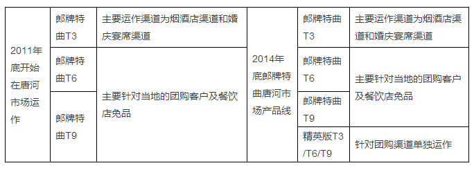 1) 產品:產品在渠道的定位,需要考慮到當地市場和消費者的消費情況,在導入市場初期,唐河市場就對郎牌特曲系列產品進行了渠道區隔。